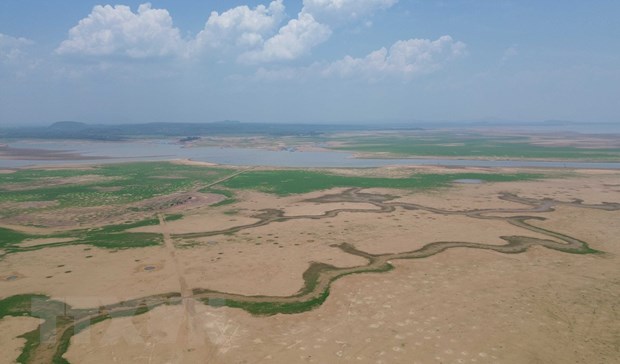 Mực nước hồ Trị An xuống rất thấp do ảnh hưởng của El Nino. (Ảnh: Công Phong/TTXVN)