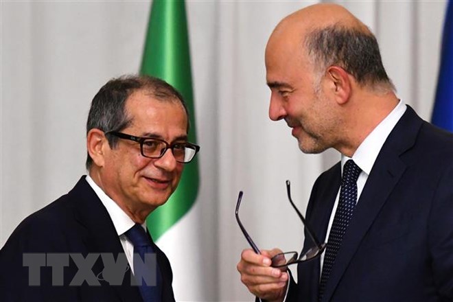 Bộ trưởng Kinh tế Italy Giovanni Tria (trái) trong cuộc họp báo chung với Ủy viên về các vấn đề kinh tế của Liên minh châu Âu Pierre Moscovici tại Rome ngày 18/10/2018. (Ảnh: AFP/TTXVN)