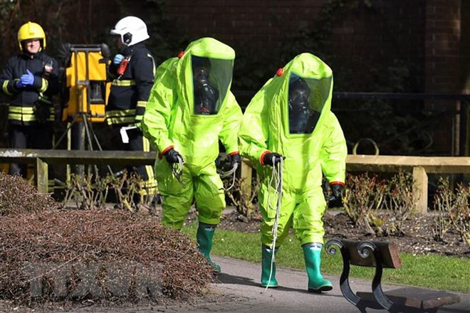 Nhân viên cơ quan dịch vụ khẩn cấp Anh điều tra tại hiện trường một vụ tấn công nghi sử dụng chất độc thần kinh ở Salisbury ngày 04/3/2018. (Nguồn: AFP/TTXVN)