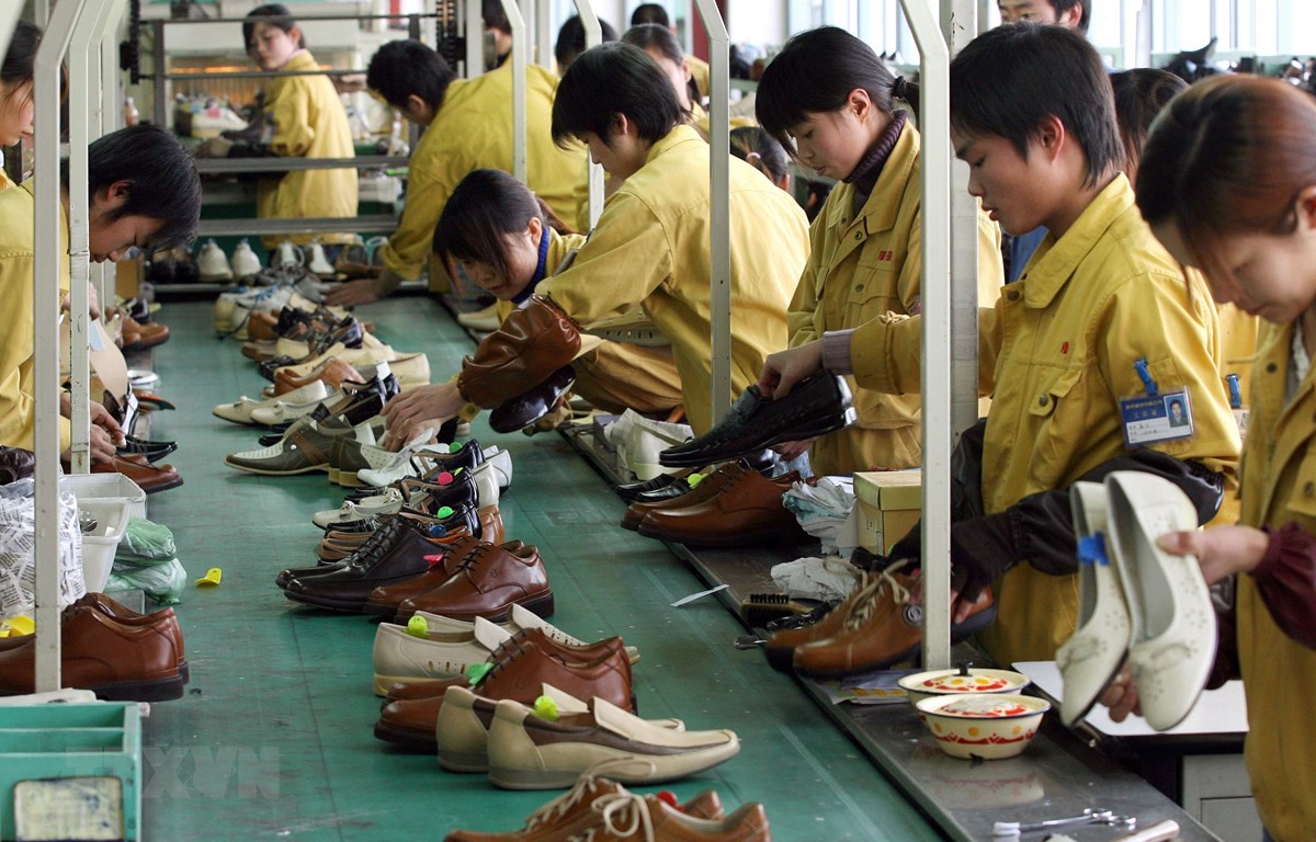 Công nhân sản xuất giầy tại nhà máy của Hãng Kangnai, thành phố Ôn Châu, tỉnh Chiết Giang, Trung Quốc. (Ảnh: AFP/TTXVN)