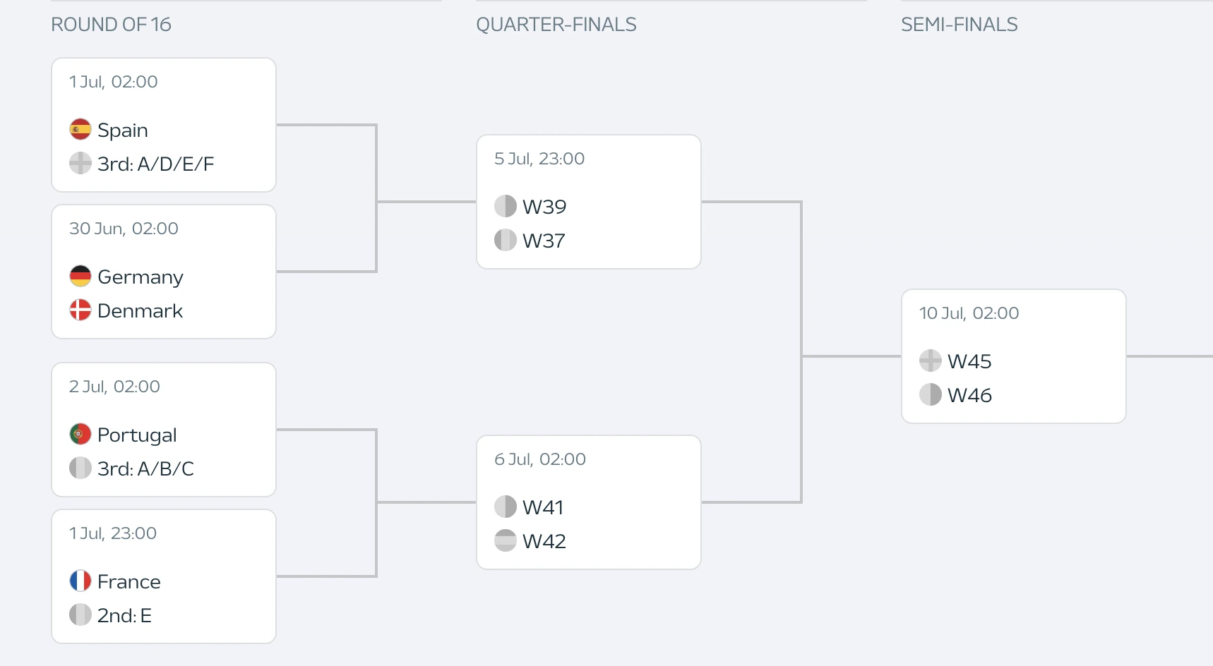 Hiện đã có 2 cặp đấu tại vòng 16 đội EURO 2024 được xác định, đó là Đức gặp Đan Mạch và Ý gặp Thụy Sĩ. Các cặp đấu còn lại sẽ được xác định sau khi bảng E và F hạ màn với loạt trận đêm nay (26/6) và rạng sáng mai (27/6).