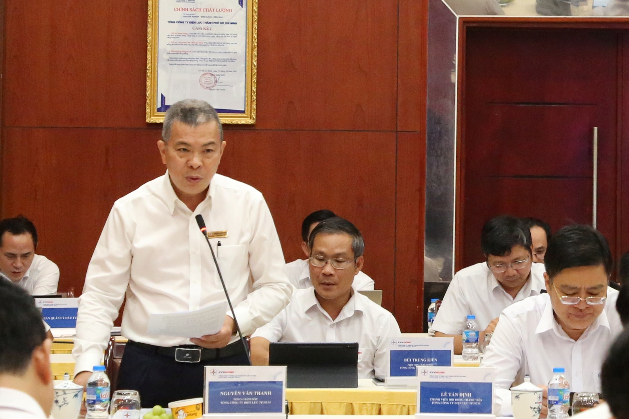 | Tổng giám đốc EVNHCMC Nguyễn Văn Thanh báo cáo kết quả hoạt động của EVNHCMC với lãnh đạo Tập đoàn Điện lực Việt Nam. |