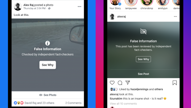 Facebook sẽ chèn một màn hình mờ màu xám cùng dòng chữ cảnh báo thông tin giả với những nội dung sai lệch. (Nguồn: Facebook)
