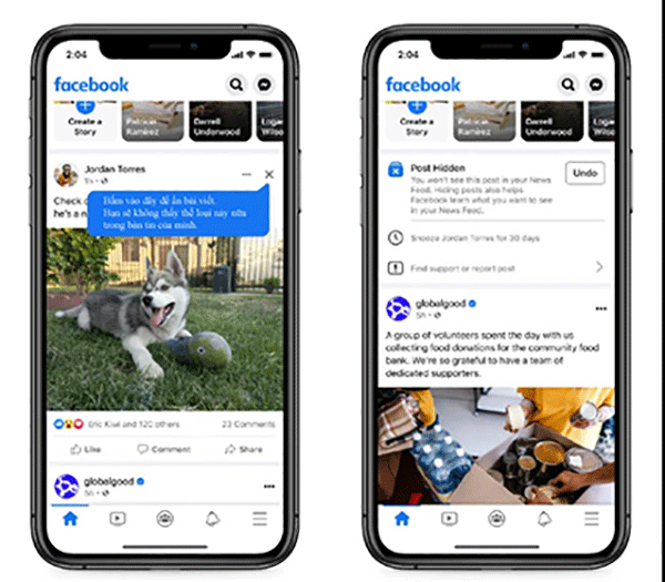 Facebook cũng cho biết họ sẽ hỏi người dùng những chủ đề mà họ không quan tâm, chẳng hạn như nấu ăn, thể thao hoặc chính trị... để có thể hiển thị cho họ những bài đăng khác có liên quan đến sở thích của họ. Công ty cho biết đang thử nghiệm cách dễ dàng hơn để người dùng cắt bớt các bài đăng mà họ không muốn thấy trong nguồn cấp dữ liệu của mình thông qua dấu “X” nhỏ ở góc trên cùng bên phải của bài đăng.