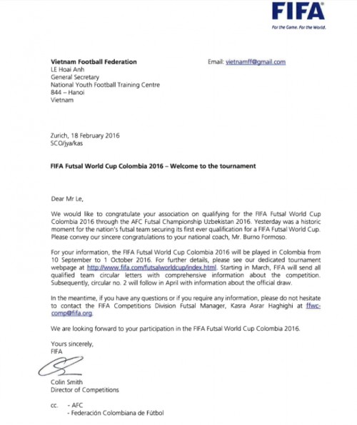 Trong thư gửi tới VFF, ông Colin Smith - Trưởng ban thi đấu FIFA đã gửi lời chúc mừng của FIFA đối với thành tích thi đấu của đội tuyển futsal VN tại VCK futsal châu Á 2016, đồng thời chào đón đội tuyển futsal VN góp mặt tại VCK World Cup 2016, diễn ra tại Comlombia từ ngày 10-9 đến 1-10 tới.