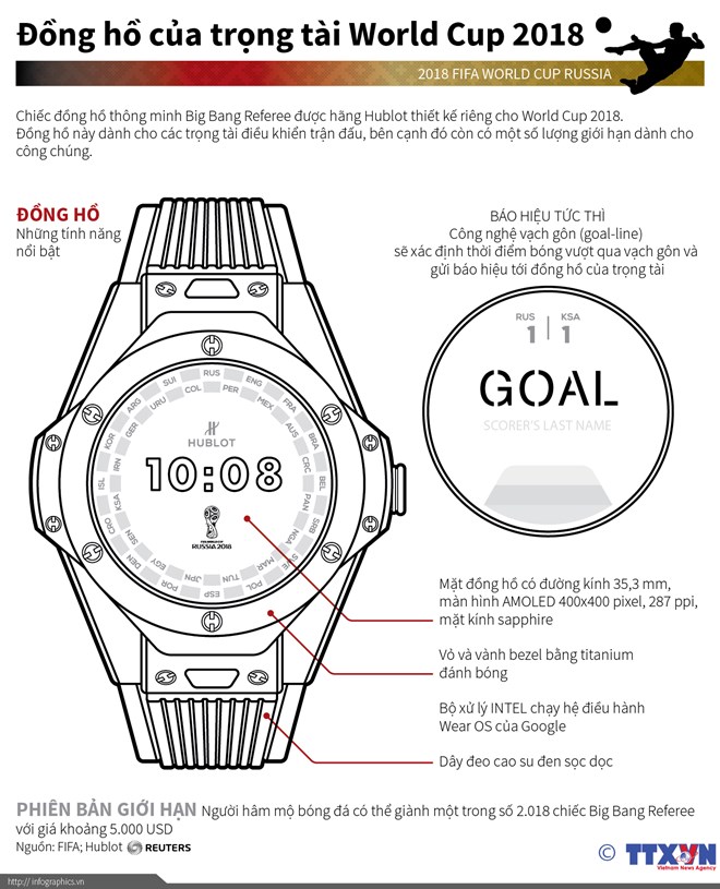 Bắt đầu từ ngày 14/6, khi trái bóng Telstar 18 chính thức lăn trên các sân cỏ nước Nga, trọng tài World Cup sẽ được trang bị đồng hồ thông minh Big Bang Referee 2018 FIFA World Cup, do hãng đồng hồ danh tiếng Hublot cung cấp nhằm hỗ trợ các "ông vua áo đen" đưa ra quyết định chuẩn xác hơn.