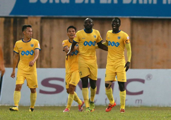 Niềm vui của các cầu thủ Thanh Hóa sau khi có bàn mở tỉ số ở phút 24. Ảnh: Nam Khánh