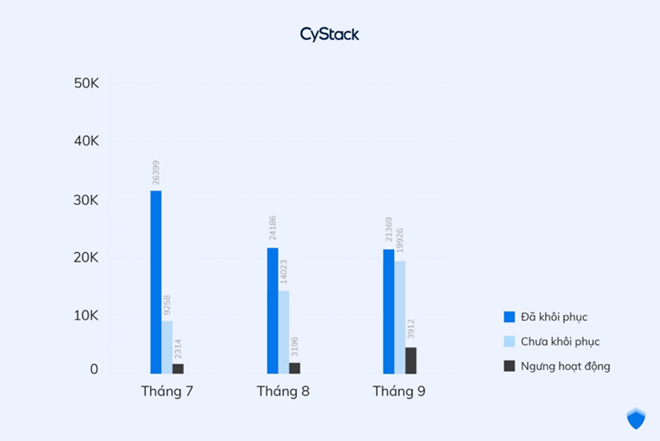 Theo đại diện CyStack, cho đến hiện tại, còn nhiều website chưa được khôi phục và loại bỏ các dấu hiệu tấn công do hacker để lại. Cụ thể là 21,48% website bị tấn công ở tháng Bảy vẫn chưa được khắc phục; số liệu ở tháng Tám và tháng Chín lần lượt là 33,87% và 44,08%. Điều này cho thấy rất nhiều chủ sở hữu và quản trị website không quan tâm đến bảo mật cho website của mình, không biết mình đã bị tấn công hoặc không biết cách xử lý sự cố.