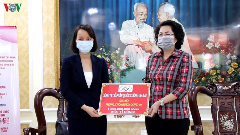 | Bà Tô Thị Bích Châu (bên phải) - Chủ tịch Uỷ ban MTTQ Việt Nam TP Hồ Chí Minh tiếp nhận ủng hộ của doanh nghiệp (nguồn: VOV) |