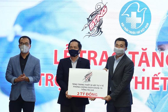 | Chủ tịch Hội Thầy thuốc trẻ Việt Nam Trần Văn Thuấn (ngoài cùng bên phải) nhận biểu trưng tài trợ thiết bị vật tư y tế phòng, chống dịch COVID-19. |