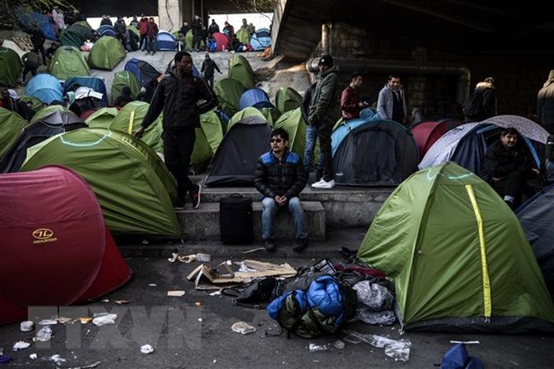 Người di cư chuẩn bị được sơ tán khỏi trại tị nạn ở khu vực Porte de la Chapelle, phía Bắc thủ đô Paris, Pháp. (Ảnh: AFP/TTXVN)