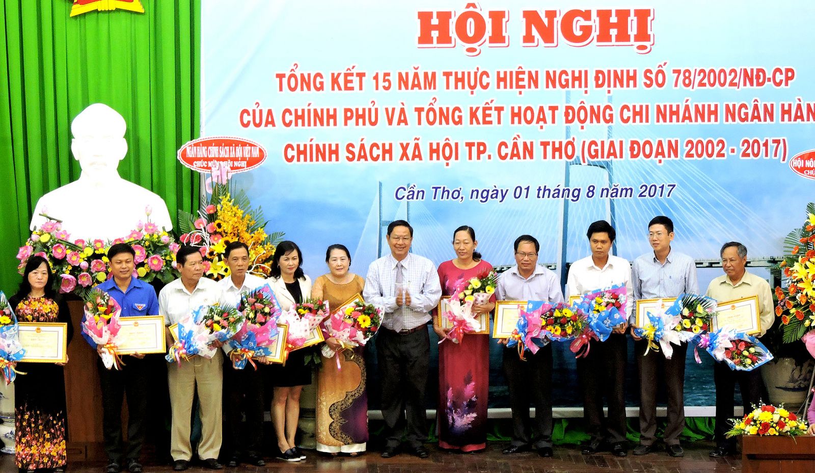 Đồng chí Lê Văn Tâm, Phó Chủ tịch Thường trực UBND TP Cần Thơ trao bằng khen cho các tập thể đạt thành tích xuất sắc góp phần thực hiện thành công chính sách tín dụng ưu đãi giai đoạn 2002-2017.