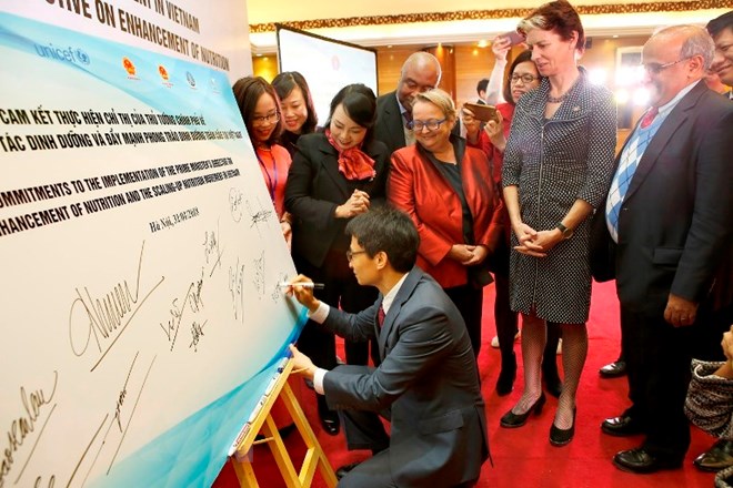 Phó Thủ tướng Vũ Đức Đam ký cam kết hưởng ứng Lễ phát động phong trào đẩy mạnh dinh dưỡng toàn cầu tại Việt Nam. (Ảnh: Dương Ngọc/TTXVN)