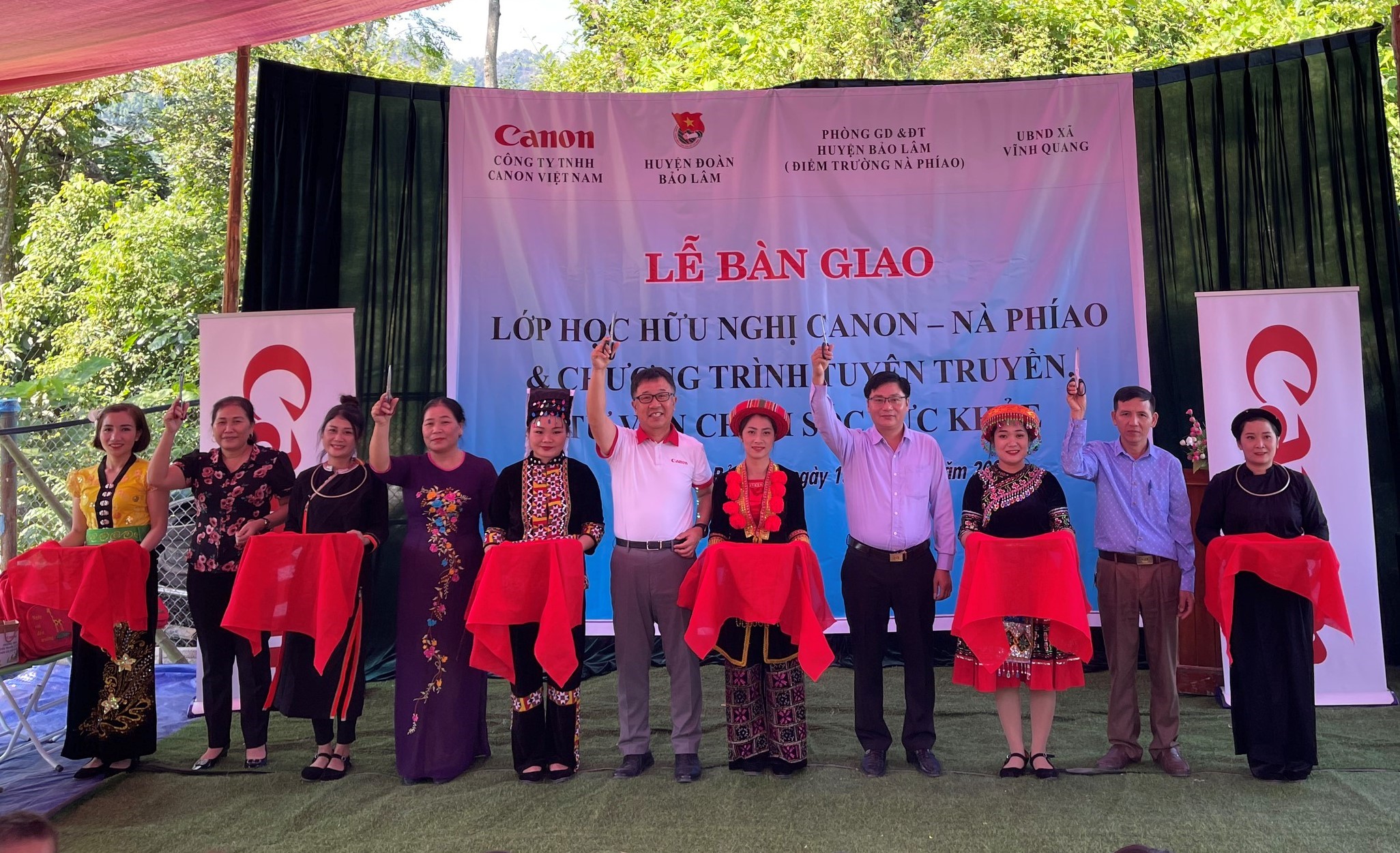 | Đại diện UBND huyện Bảo Lâm, công ty Canon Việt Nam và nhà trường tại lễ bàn giao (Ảnh: Thu Huyền) |