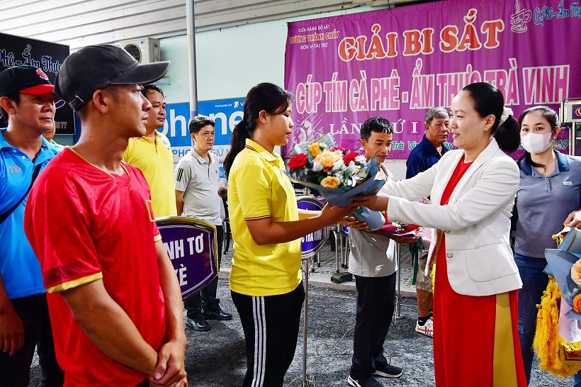 Đồng chí Nguyễn Thị Ngọc Nhi, Phó Chủ tịch UBND thành phố Trà Vinh tặng hoa chúc mừng các đơn vị tham gia giải.