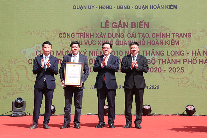 Tại buổi lễ, Bí thư Thành ủy Hà Nội Vương Đình Huệ đã trao bằng công nhận công trình chào mừng kỷ niệm 1010 năm Thăng Long - Hà Nội và Đại hội đại biểu lần thứ XVII Đảng bộ TP Hà Nội (nhiệm kỳ 2020-2025) cho lãnh đạo quận Hoàn Kiếm. Chủ tịch UBND TP Chu Ngọc Anh đã trao tặng Bằng khen của UBND TP cho 3 tập thể, 3 cá nhân có thành tích xuất sắc trong tổ chức thực hiện công trình./.