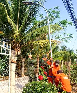 | Bộ đội tham gia gắn đèn chiếu sang. |