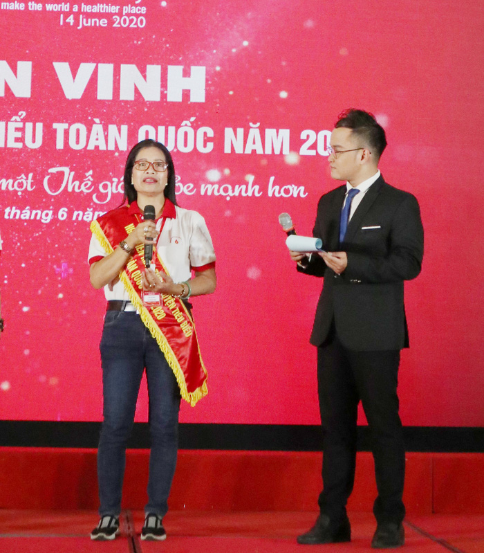 Gặp gỡ bà Trần Thị Mai (54 tuổi, ở Cam Ranh, Khánh Hòa) tại lễ tôn vinh người hiến máu tiêu biểu toàn quốc năm 2020 vừa diễn ra tại Hà Nội, bà chia sẻ: Từng chứng kiến sự ra đi của người khác do không đủ máu để truyền và với chung mục đích sẻ chia những giọt hồng đến với người bệnh cần máu, bà đã hiến máu tình nguyện 95 lần kể từ lần hiến máu đầu tiên vào năm 2000. Bà Mai cũng là người có số lần hiến máu nhiều nhất trong 100 đại biểu hiến máu tình nguyện được tôn vinh năm nay và là một trong số ít người được tôn vinh lần thứ 2 với nghĩa cử cao đẹp này.