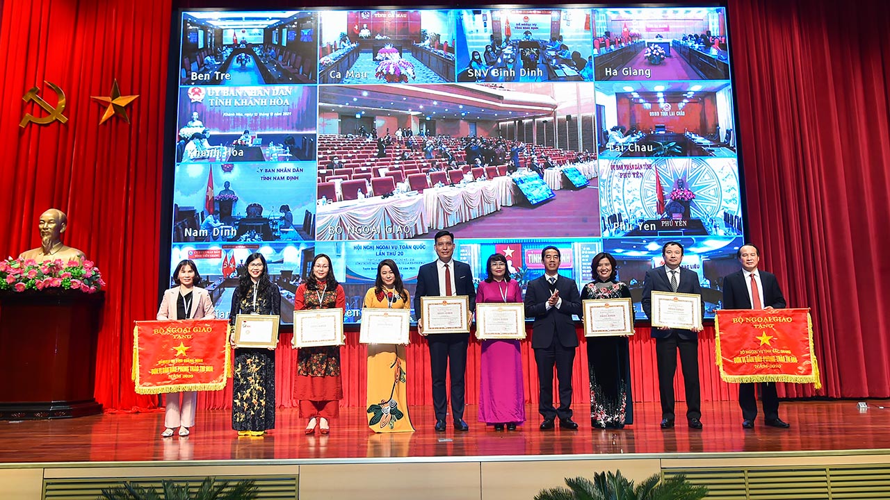 | Thứ trưởng Ngoại giao Tô Anh Dũng đã trao Cờ Thi đua của Bộ Ngoại giao năm 2020 và Bằng khen của Bộ trưởng Bộ Ngoại giao cho các Sở Ngoại vụ và cá nhân. |