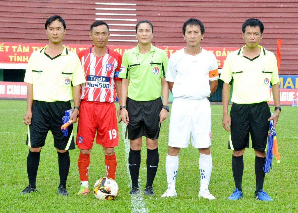 Nữ trọng tài Trương Thị Lệ Trinh (giữa) điều hành giải đấu phong trào ở Long An (Ảnh tư liệu Báo Long An online)