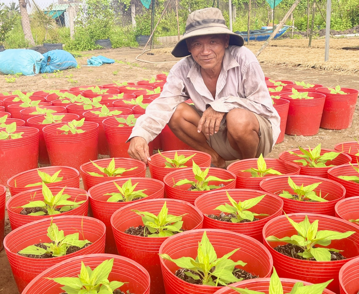 Anh Hóa còn tận dụng mảnh sân và đất xung quanh nhà để trồng hoa bán vào dịp tết, các ngày rằm lớn trong năm. Đợt này, anh trồng hơn 6.000 chậu vạn thọ, 100 chậu hướng dương, 200 chậu mào gà, 50 chậu hoa giấy phục vụ thị trường Tết Nguyên đán Giáp Thìn năm 2024. Theo anh Hóa, trồng hoa đòi hỏi phải có kỹ thuật và kinh nghiệm mới có thể xử lý cho hoa nở đúng thời điểm, đẹp, tròn, đều,... Bên cạnh đó, anh Hóa còn kinh doanh xơ dừa, tro trấu,... thu nhập hơn 5 triệu đồng/tháng.