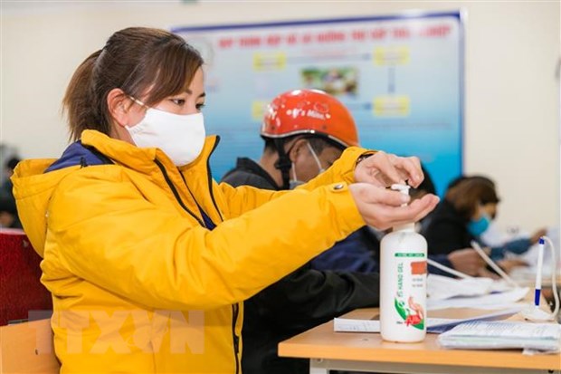 Người dân nghiêm túc thực hiện đeo khẩu trang và sát khuẩn theo quy định. (Ảnh: Bích Huệ/TTXVN)