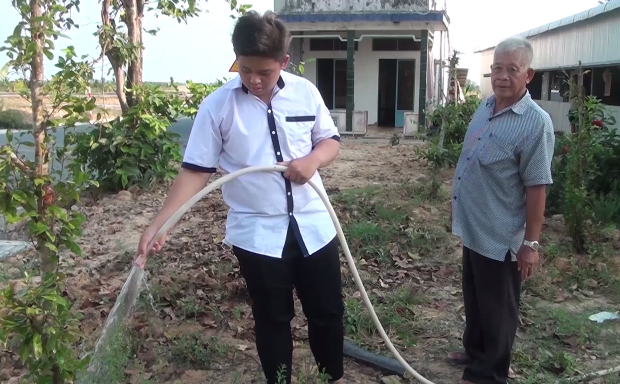 Ông Huỳnh Văn Cọp cùng cháu nội chăm sóc vườn cây của gia đình