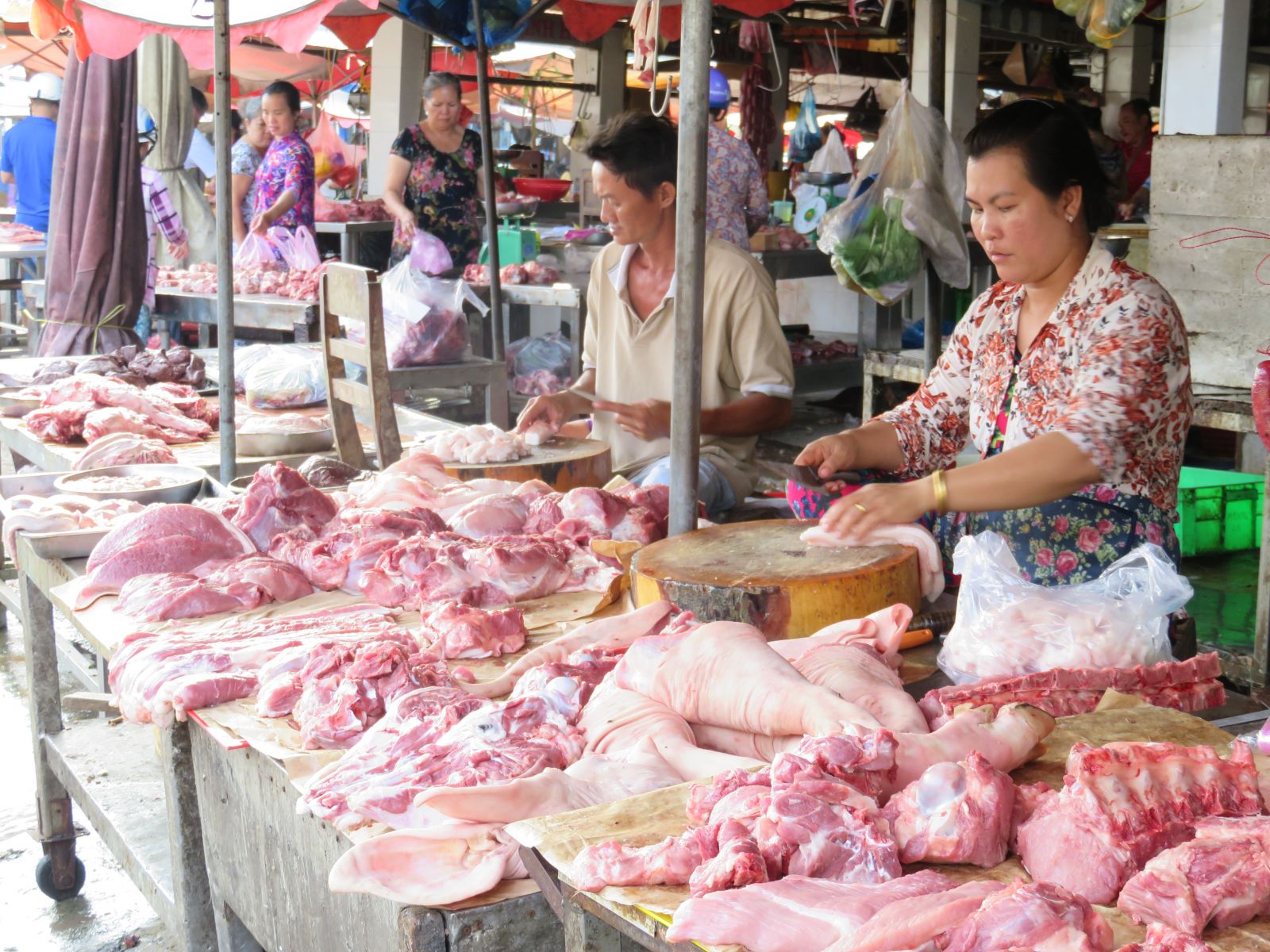 Giá heo hơi tăng mạnh khiến thịt heo bán ra tại chợ cũng tăng vọt. Chị Quy, tiểu thương bán thịt heo tại chợ phường 1, TP.Tân An cho biết, bình quân mỗi kg thịt bán ra tăng từ 10.000 - 20.000 đồng/kg. Theo đó, thịt đùi có giá từ 70.000 - 80.000 đồng/kg, sườn non có giá từ 120.000 - 140.000 đồng/kg,...