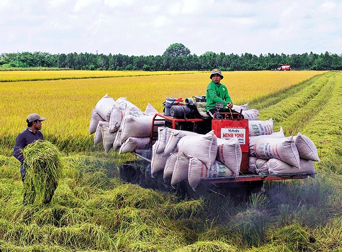 Lúa sau thu hoạch được máy kéo chở đến tận bờ ruộng để nông dân cân bán lúa tươi cho thương lái và doanh nghiệp. Nông dân không phải lo tình trạng thiếu nhân công trong thu hoạch lúa. Hiện giá thuê máy GÐLH thu hoạch lúa tại nhiều nơi ở mức 280.000-300.000 đồng/công.