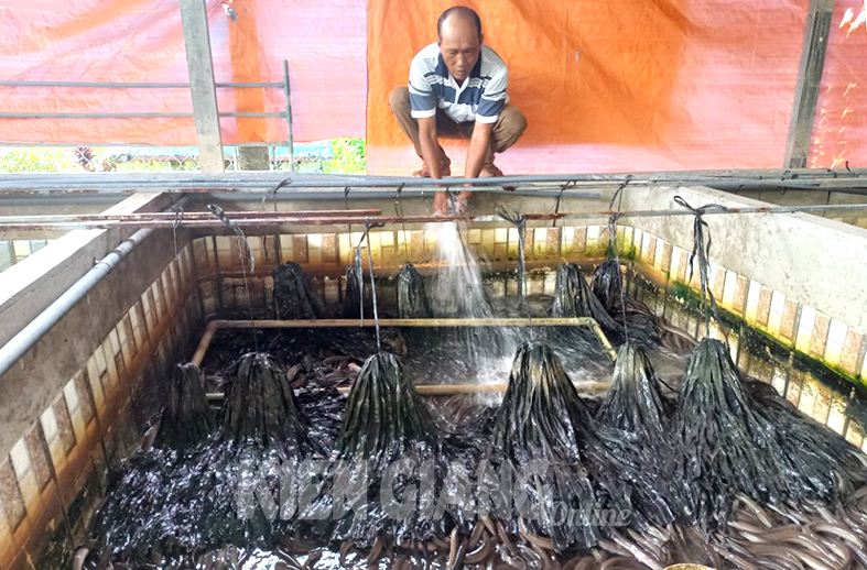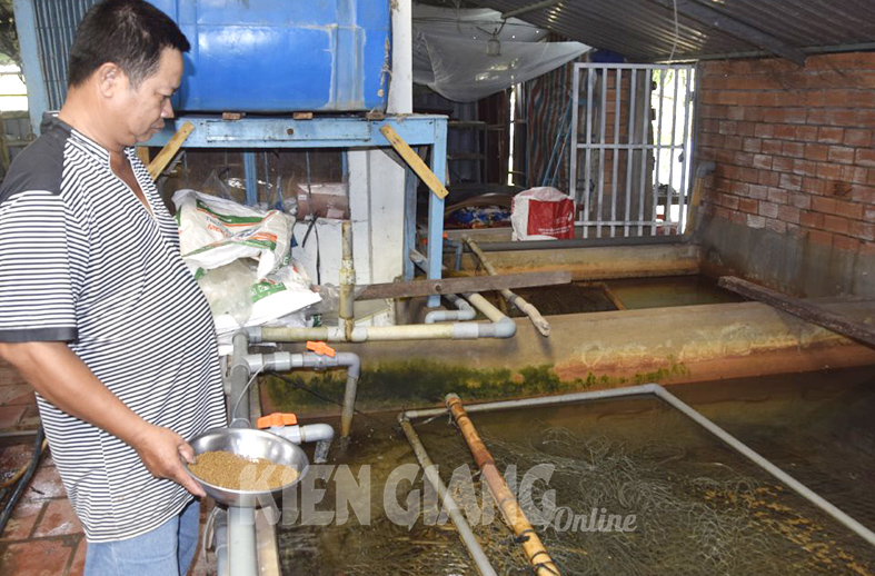 Anh Nguyễn Văn Diễn, ngụ ấp Xẻo Đước 3, xã Đông Yên, huyện An Biên chăm sóc lươn.
