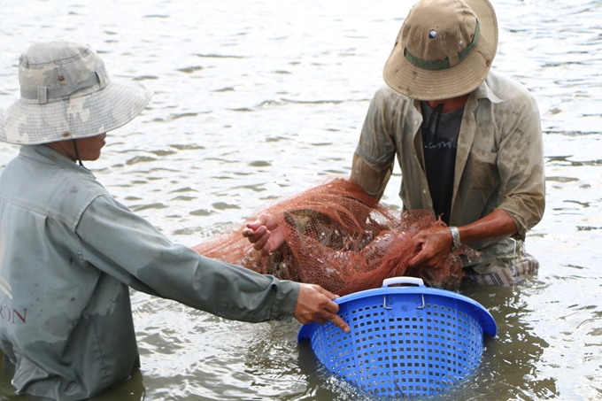 | Nông dân thu hoạch tôm ở huyện Mỹ Xuyên, tỉnh Sóc Trăng (Ảnh: Thanh Nam) |