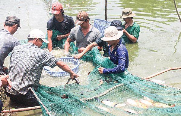 Thu hoạch cá nuôi tại một hộ dân ở quận Ô Môn, TP Cần Thơ.