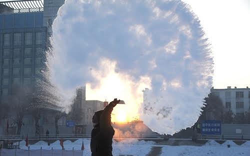 Nước sôi lập tức đóng băng ngay khi được hất ra ngoài ở Cáp Nhĩ Tân, tỉnh Hắc Long Giang (Ảnh: Rex)