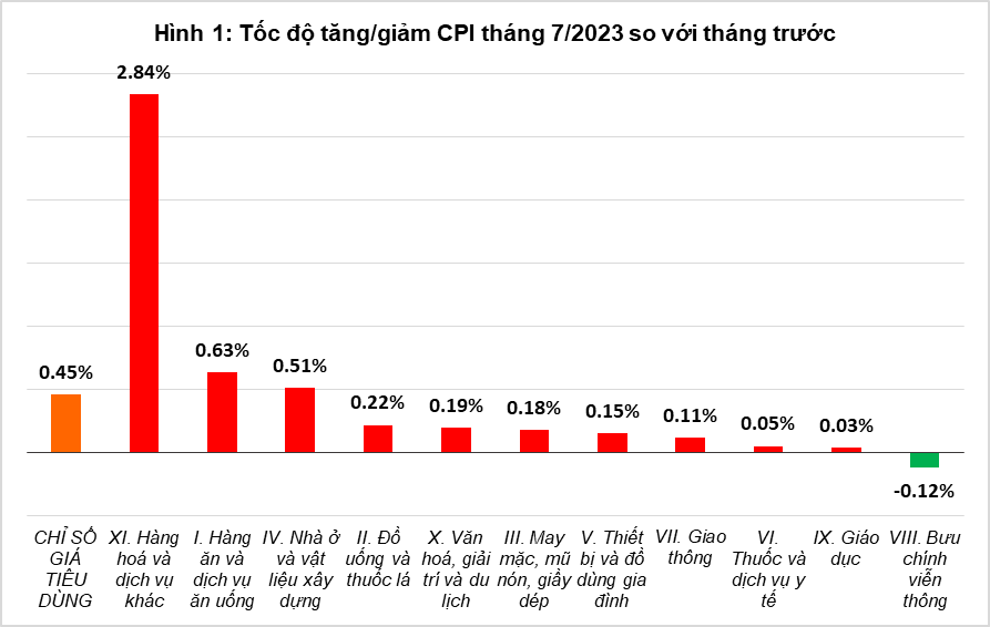 Theo báo cáo của Tổng cục thống kê, so với tháng trước, CPI tháng 7/2023 tăng 0,45% (khu vực thành thị tăng 0,34%; khu vực nông thôn tăng 0,58%). Trong 11 nhóm hàng hóa và dịch vụ tiêu dùng chính, có 10 nhóm hàng tăng giá so với tháng trước; riêng nhóm bưu chính viễn thông giá giảm 0,12%.