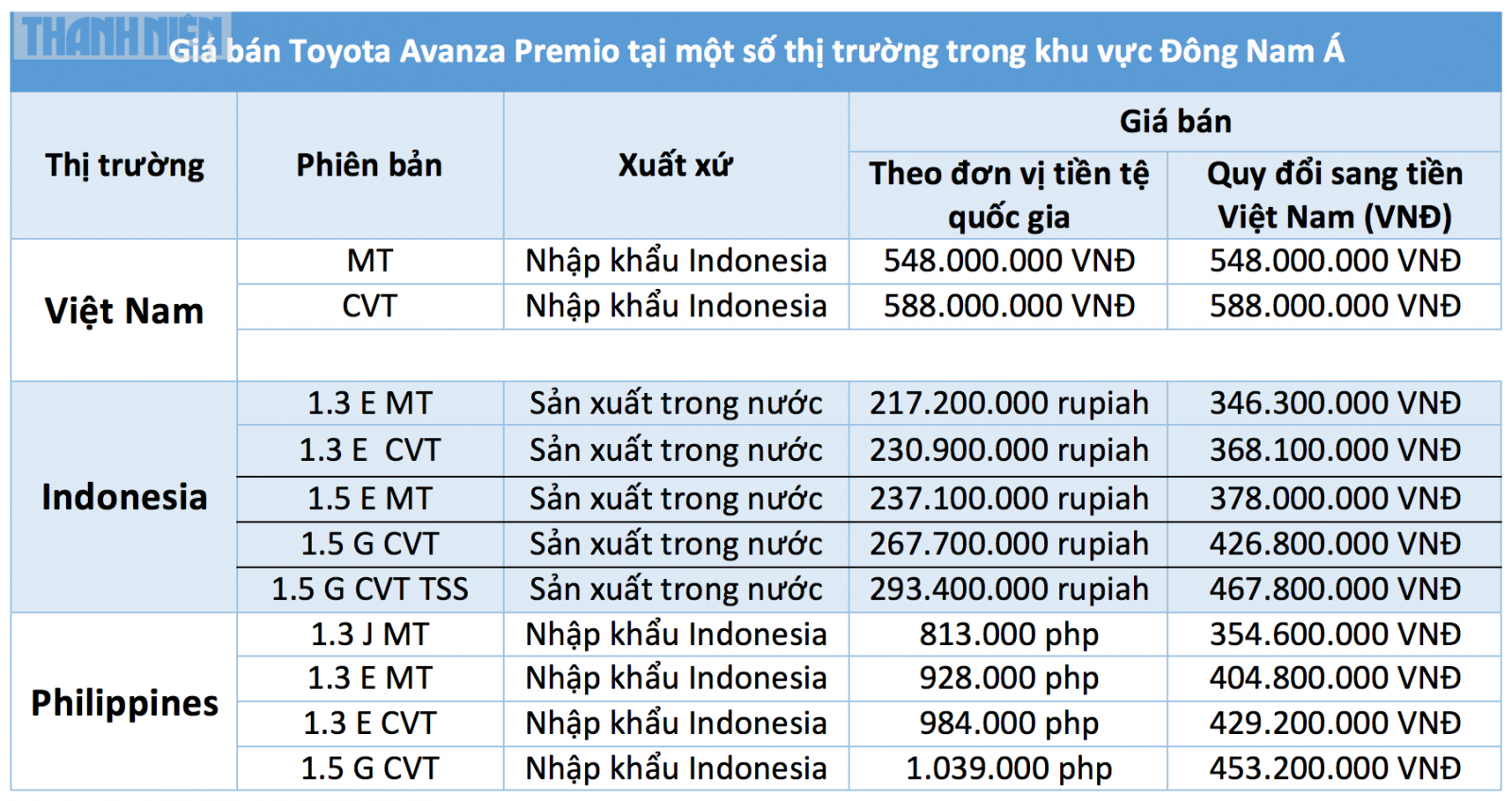 Cụ thể, tại Việt Nam Toyota Avanza Premio có hai phiên bản MT và CVT có giá từ 548 - 588 triệu đồng. Trong khi đó, tại Indonesia Toyota Avanza thế hệ mới có tới 5 phiên bản, gồm 2 phiên bản 1.3 E MT, 1.3 E CVT có giá từ 217,2 - 230,9 triệu rupiah, tương đương 346,3 - 378 triệu đồng. Hai phiên bản động cơ 1.5 của Toyota Avanza tại Indonesia, gồm 1.5 G CVT và 1.5 G CVT TSS có giá 267,7 - 293,4 triệu rupiah, tương đương 426,8 - 467,8 triệu đồng, thấp hơn thị trường Việt Nam từ 120,2 - 121,2 triệu đồng.