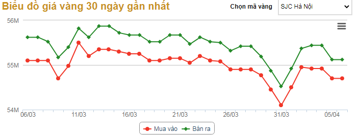Cùng với đà tăng của thế giới, sáng 6/4, giá vàng trong nước cũng tăng từ 100.000-150.000 đồng/lượng. Cụ thể, vào lúc 9h30’ sáng ngày 6/4, Tập đoàn Vàng bạc đá quý DOJI niêm yết giá vàng SJC khu vực Hà Nội ở mức 54,82 triệu đồng/lượng (mua vào) và 55,25 triệu đồng/lượng (bán ra); tăng 120.000 đồng/lượng chiều mua vào và 150.000 đồng/lượng chiều bán ra so với phiên giao dịch trước; chênh lệch mua – bán là 430.000 đồng/lượng.