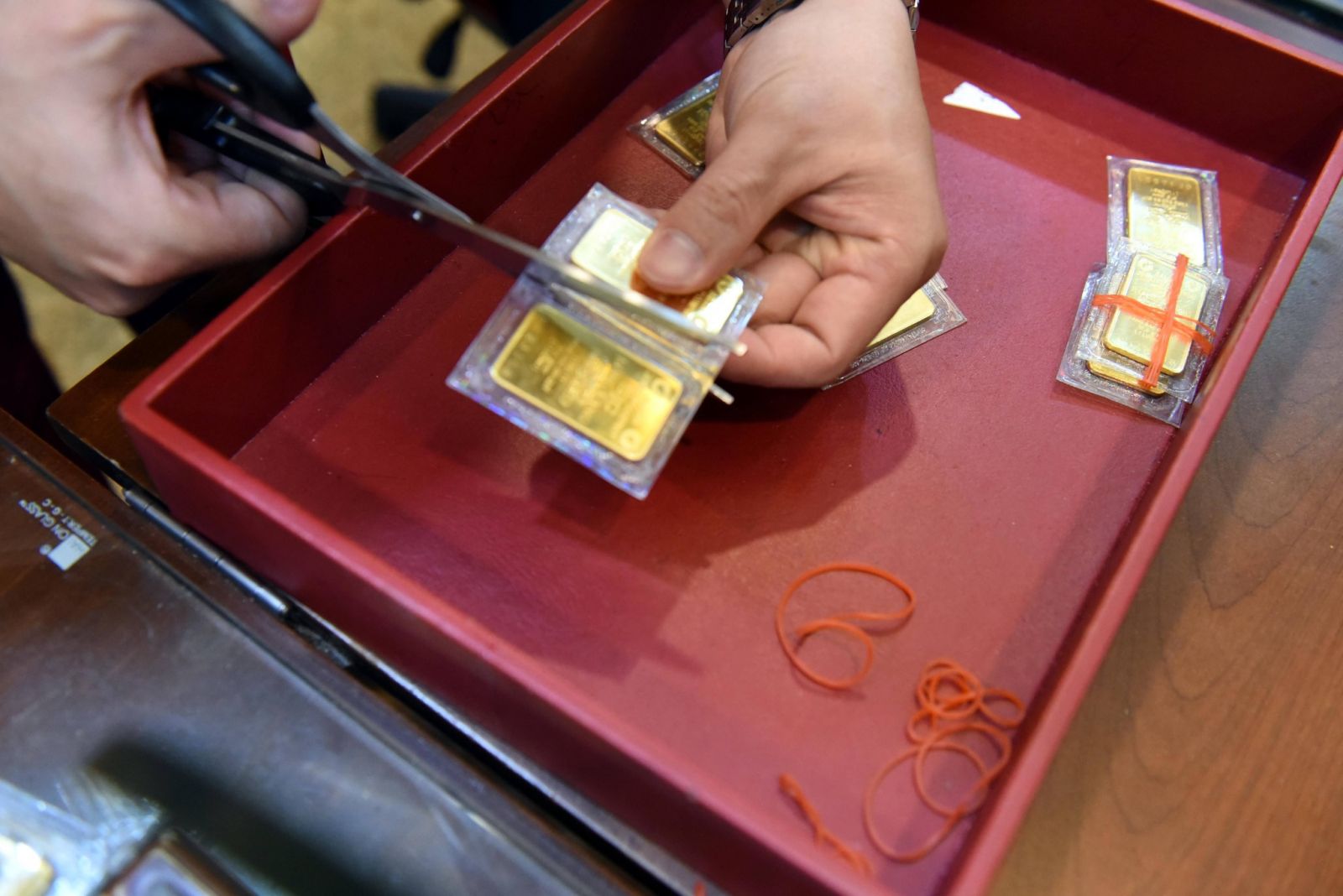 Sáng 15/5, vàng miếng được Công ty vàng bạc đá quý Sài Gòn - SJC mua vào 68,5 triệu đồng/lượng và bán ra 69,5 triệu đồng/lượng. So với cuối tuần qua, mỗi lượng vàng miếng SJC giảm 1,25 triệu đồng ở chiều mua vào và giảm 950.000 đồng ở chiều bán ra. Chiều mua vào giảm nhiều hơn nên chênh lệch với giá bán tăng lên 1 triệu đồng, thay vì mức 700.000 đồng như cuối tuần qua. Còn vàng nhẫn SJC 99,99 loại 1-2 chỉ được mua vào 54,2 triệu đồng/lượng và bán ra 55,1 triệu đồng/lượng, giảm 550.000 đồng so với cuối tuần qua.