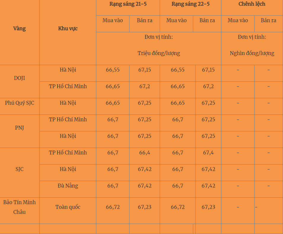 Giá vàng trong nước cập nhật 5 giờ 30 sáng ngày 22/5 như sau: