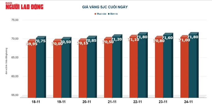 Tại Việt Nam, giá vàng SJC cuối ngày 24/11 giao dịch tại 71,8 triệu đồng/lượng – tăng 350.000 đồng/lượng so với mức giá đầu ngày là 71,45 triệu đồng/lượng.