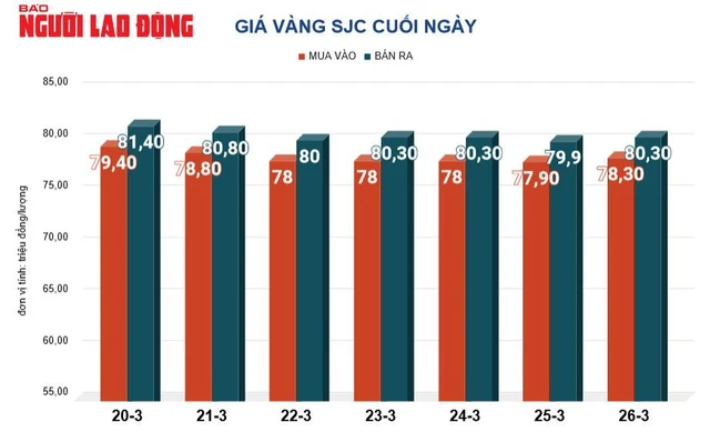 Trước đó, tại Việt Nam, giá vàng SJC trong ngày 26/3 tăng 300.000 đồng/lượng, chốt cuối ngày tại 80,3 triệu đồng/lượng./.
