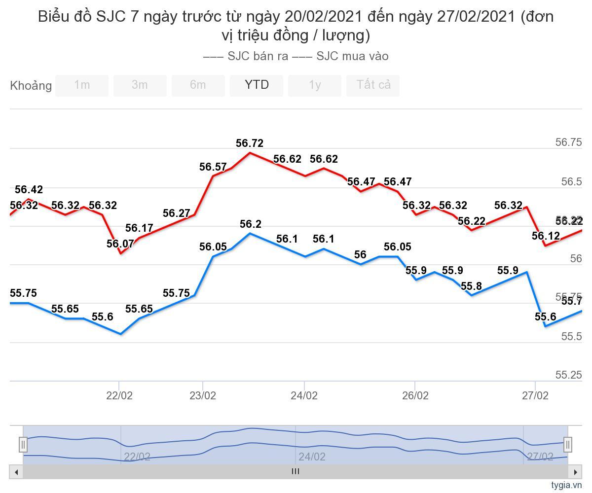 Giá vàng SJC lên mức cao nhất trong tuần là 56,2 triệu đồng/lượng (mua vào) và 56,7 triệu đồng/lượng (bán ra) vào thời điểm sáng ngày 23/2. Mức thấp nhất là 55,8 triệu đồng/lượng (mua vào) và 56,12 triệu đồng/lượng (bán ra) vào ngày 27/2.