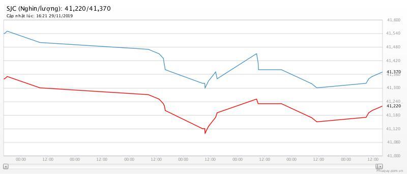 Công ty vàng bạc đá quý Sài Gòn niêm yết giá vàng SJC ở mức 41,10 triệu đồng/lượng (mua vào) và 41,35 triệu đồng/lượng (bán ra), không đổi ở cả 2 chiều mua vào và chiều bán ra so với cuối giờ ngày 28/11.