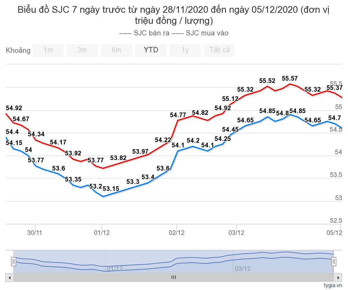 Công ty vàng bạc đá quý Sài Gòn niêm yết giá vàng SJC áp dụng cho khu vực Hà Nội ở mức 54,55 triệu đồng/lượng (mua vào) và 55,22 triệu đồng/lượng (bán ra), tăng 100 nghìn đồng ở cả 2 chiều mua vào và chiều bán ra so với cuối phiên giao dịch 2/12.