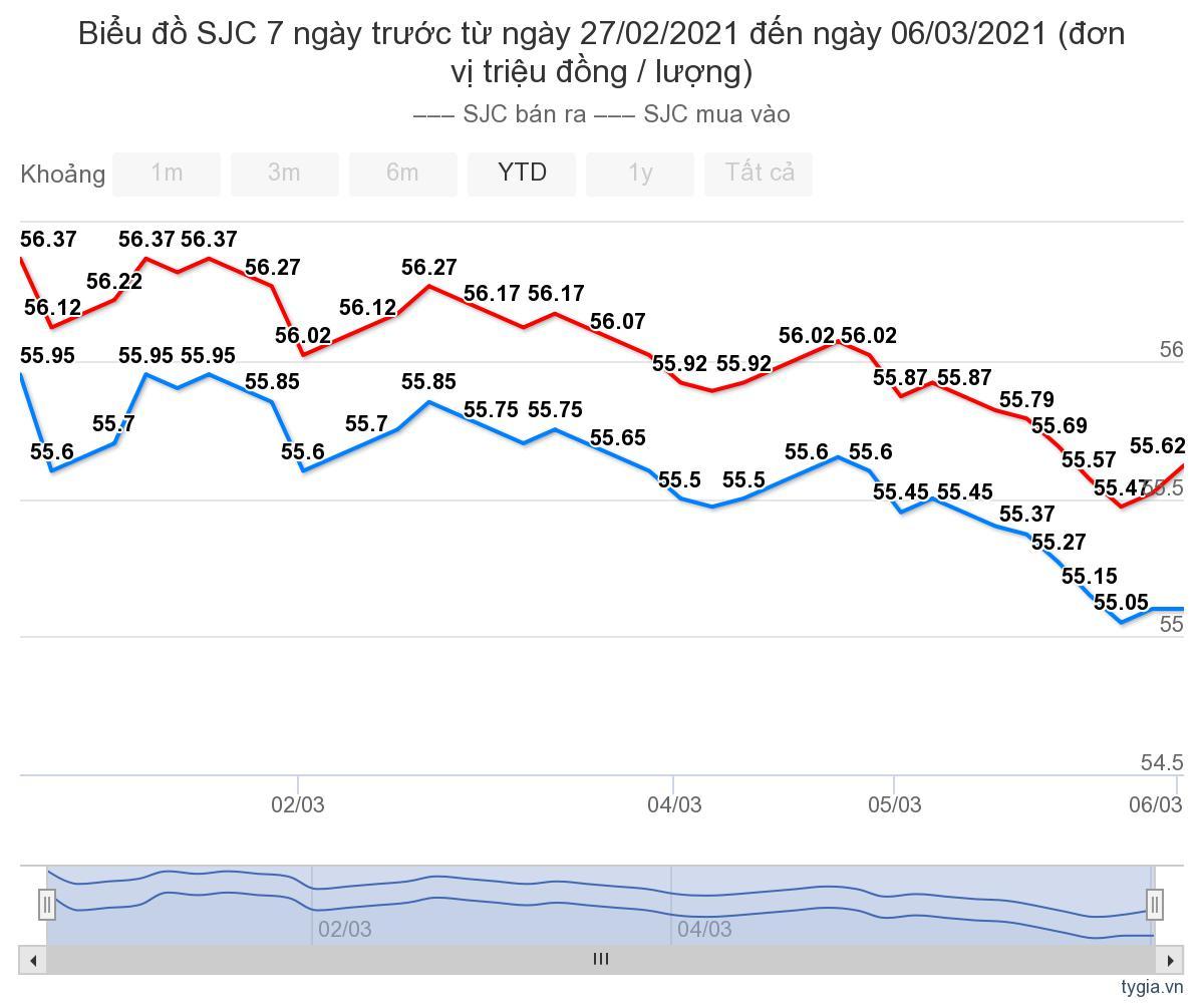 Giá vàng SJC lên mức cao nhất trong tuần là 55,95 triệu đồng/lượng (mua vào) và 56,37 triệu đồng/lượng (bán ra) vào thời điểm sáng ngày 1/3. Mức thấp nhất là 55,05 triệu đồng/lượng (mua vào) và 55,47 triệu đồng/lượng (bán ra) vào ngày 5/3.