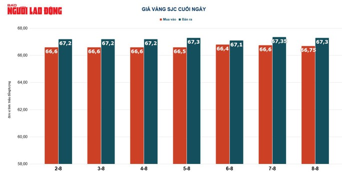 Trước đó, tại Việt Nam, giá vàng SJC trong ngày 8-8 giảm 50.000 đồng/lượng, chốt cuối ngày tại 67,3 triệu đồng/lượng.