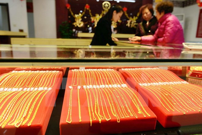 Trang sức bằng vàng được bày bán tại một cửa hàng ở thành phố Thao Đảo, tỉnh Sơn Đông, Trung Quốc. (Nguồn: AFP/TTXVN)