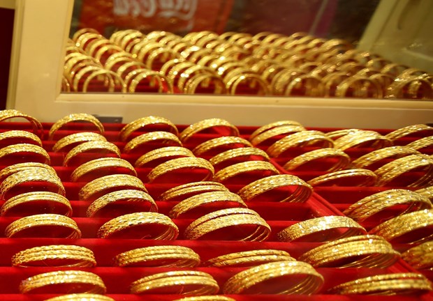 Vàng được bày bán tại cửa hàng kim hoàn ở Yangon, Myanmar. (Ảnh: THX/TTXVN)