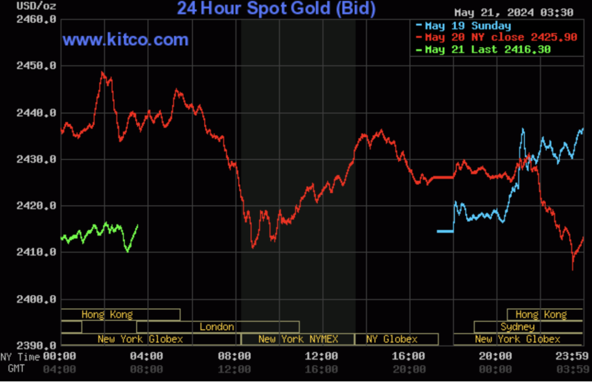 Từ sát mức 2.450 USD/ounce chiều hôm qua, giá vàng thế giới đã bốc hơi khoảng 32 USD/ounce, tương đương 982.000 đồng/lượng, về mức 2.416 USD/ounce vào chiều nay.