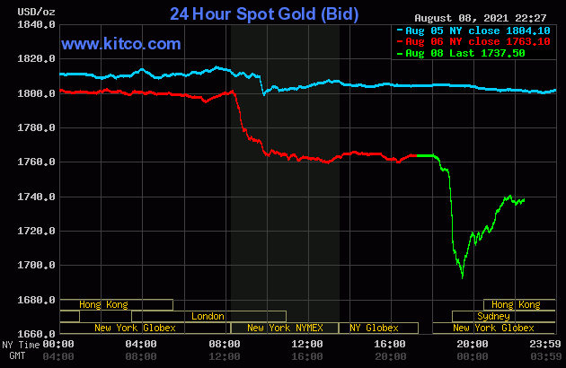 Thời điểm 8h45 theo giờ Việt Nam, giá vàng thế giới đứng ở mức 1.737 USD/ounce, giảm tới 26 USD/ounce so với chốt phiên tuần trước. Đầu phiên sáng nay, giá vàng đã giảm mạnh xuống chỉ còn 1.678 USD/ounce, mức giá thấp nhất trong vòng 4 tháng qua.