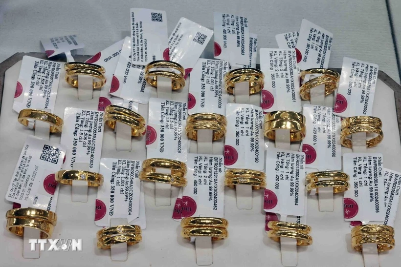 Vàng trang sức bày bán tại cửa hàng của Tập đoàn Vàng bạc đá quý Doji (Ảnh: Trần Việt/TTXVN)